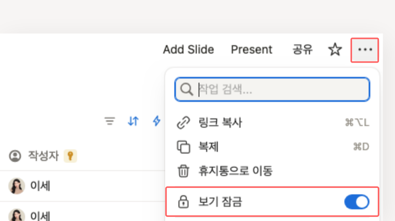 2๏ธโฃ ๋ฐ์ดํฐ๋ฒ ์ด์ค '๋ณด๊ธฐ ์ ๊ธ' ์ค์ ํ๊ธฐ ๋ง์ฝ ํ์๋ค ๋ชจ๋ ๋ฐ์ดํฐ๋ฒ ์ด์ค์ ์ ๊ทผํ์ฌ ์์ฑ ๋ฐ ์์ ์ ํด์ผ ํ๋ค๋ฉด, โ๋ณด๊ธฐ ์ ๊ธโ ๊ธฐ๋ฅ์ผ๋ก ๋ณดํธํ์ธ์. ์ด ๊ธฐ๋ฅ์ ์ผ๋๋ฉด ๋ค๋ฅธ ํ์์ด ์ค์๋ก ํํฐ๋ฅผ ์์ ํ๊ฑฐ๋ ์์ฑ์ ์ญ์ ํ์ง ๋ชปํด์. ํนํ โ๋์๋ณด๋์ฉ ๋ทฐโ๋ โ๋ฆฌํฌํธ์ฉ ๋ทฐโ์ฒ๋ผ ๊ตฌ์กฐ๊ฐ ์ค์ํ ํ๋ฉด์ด๋, ๋ง์ ์ฌ๋์ด ์ฌ์ฉํ๋ ๋ฐ์ดํฐ๋ฒ ์ด์ค๋ผ๋ฉด ๋ณด๊ธฐ ์ ๊ธ์ ์ถ์ฒํฉ๋๋ค.