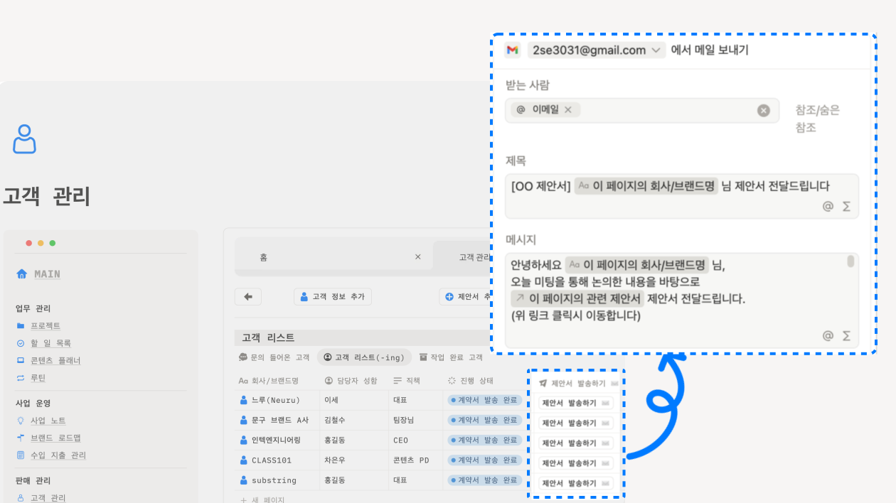 예를 들어, 상담 요청이 들어왔을 때 확인 메일을 보내거나, 프로젝트 상태가 바뀌었을 때 담당자나 고객에게 안내 메일을 보내는 상황처럼요. 매번 메일을 새로 쓰지 않아도, 노션에 정리된 정보를 그대로 불러와 버튼 한 번으로 발송할 수 있습니다.
