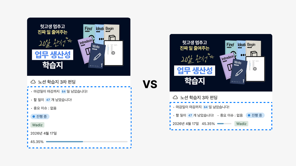 ์๋ฅผ ๋ค์ด ๋ ์ง, ์งํ ์ํ, ๋ด๋น์, ์งํ๋ฅ ๋ฑ ์งง๊ณ ๊ฐ๊ฒฐํ ์ ๋ณด๋ค์ ๊ฐ๊ฐ ํ ์ค์ ์ฐจ์งํ๋ ๋์ , ์ค๋ฅธ์ชฝ ์์์ฒ๋ผ ํ ์ค ์์์ ๊น๋ํ๊ฒ ์ ๋ ฌ๋ผ์! ๋๋ถ์ ์นด๋ ๋์ด๊ฐ ์ค์ด๋ค๊ณ , ํ ํ๋ฉด์์ ๋ ๋ง์ ์ ๋ณด๋ฅผ ๋ณผ ์ ์๊ฒ ๋์ต๋๋ค.