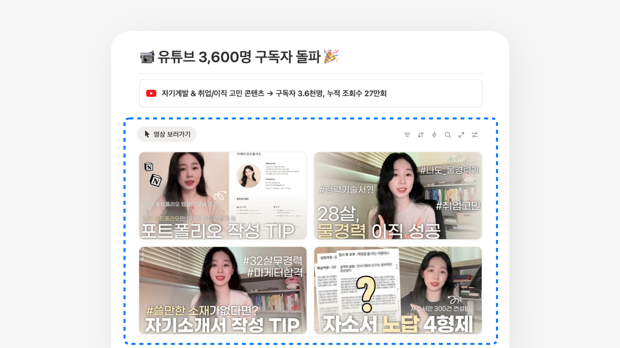 ๋ฐ์ดํฐ๋ฒ ์ด์ค ๊ฐค๋ฌ๋ฆฌ์ ์ธ๋ค์ผ(์นด๋)์ ๊ธฐ์กด์๋ ์ ์ ์ธ ์ด๋ฏธ์ง๋ง ๋ฃ์ ์ ์์์ด์! ํ์ง๋ง ์ด์ png, jpg ํ์ผ๋ฟ๋ง ์๋๋ผ gif, mp4, ์ ํ๋ธ ์์๋ ์ค์ ํ ์ ์์ต๋๋ค.